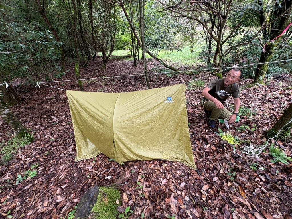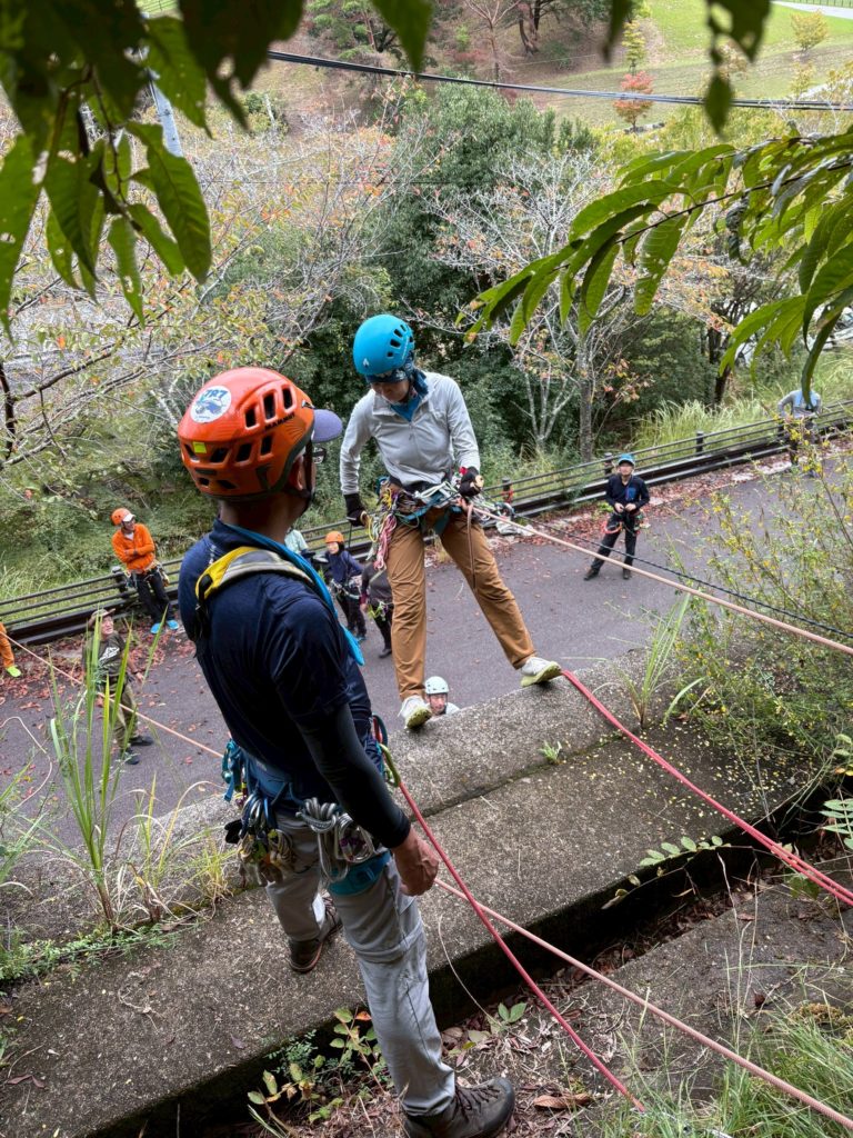 2日目は、雨も上がり、フィールドでの講習が出来ました。転落した負傷者をロープを使って、引き上げたり、降ろしたり、倍力のシステムの作り方や、様々な懸垂下降の方法を習得しました。また、ツエルトを使ったビバークの方法などを教えて頂きました。