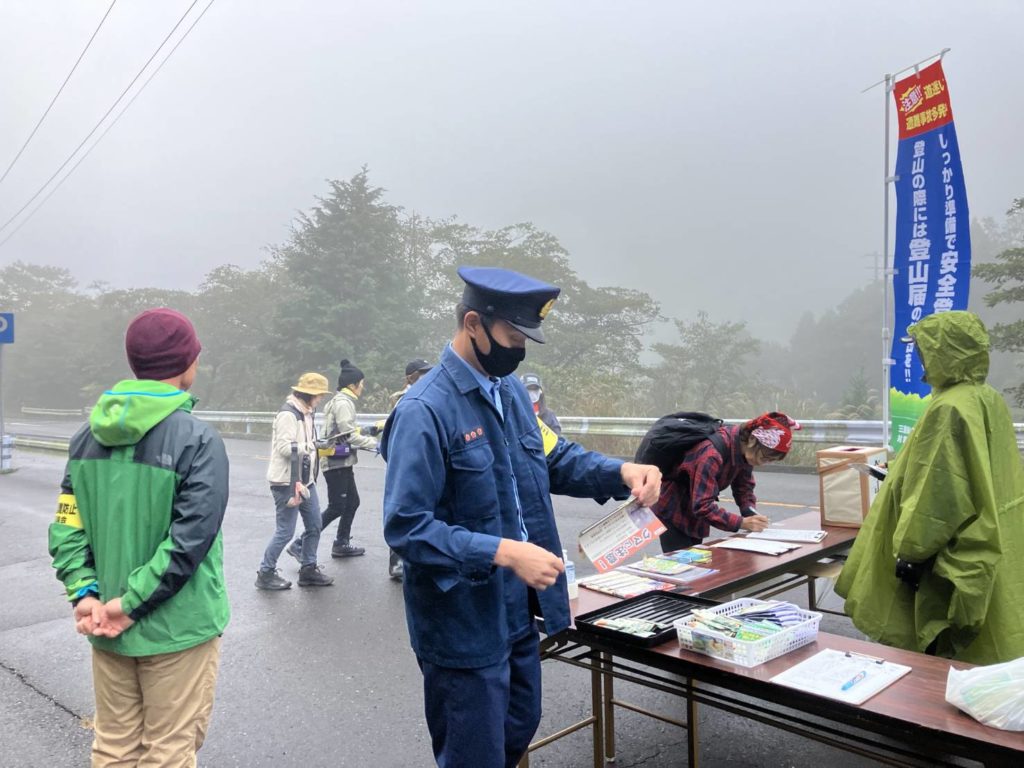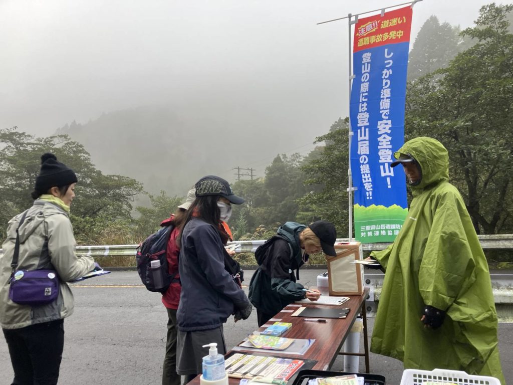 鈴鹿山系を中心に三重県内の主な登山口に協議会のメンバーが立ち、登山届の提出の呼びかけ、遭難情報やクマに関する注意喚起等の掲出やチラシ等の配付、及び装備品や登山ルート等安全登山指導とアンケートを実施しました。