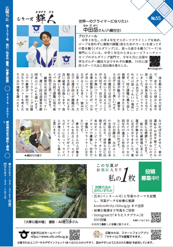 このうち、知多市在住の中⽥岳選手が知多市の広報誌「広報ちた」11月号で紹介されました。